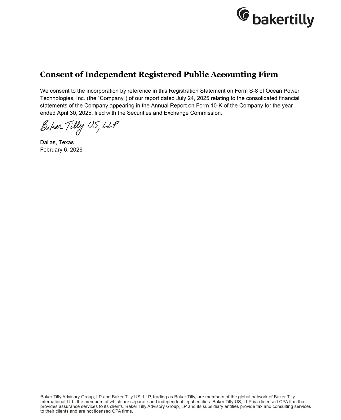 We consent to the incorporation by reference in this Registration Statement of Ocean Power Technologies, Inc. on Form S-8 to be filed on or about February 6, 2026 of our report dated July 25, 2024, except for Note 15 as to which the date is July 24, 2025, on our audit of the financial as of April 30, 2024 and for the year then ended, which report was included in the Annual Report on Form 10-K filed July 24, 2025.